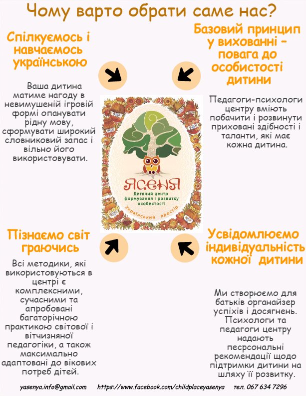 Якщо у вас є запитання або ви бажаєте заисатись на заняття, звертайтесь за будь-якими контактами центру: фейсбук, е-мейл, телефон (див.нижче розділ "Контакти")