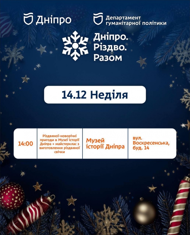 - 14:00 — Різдвяно-новорічні пригоди в Музеї історії Дніпра + майстерклас з виготовлення різдвяної свічки