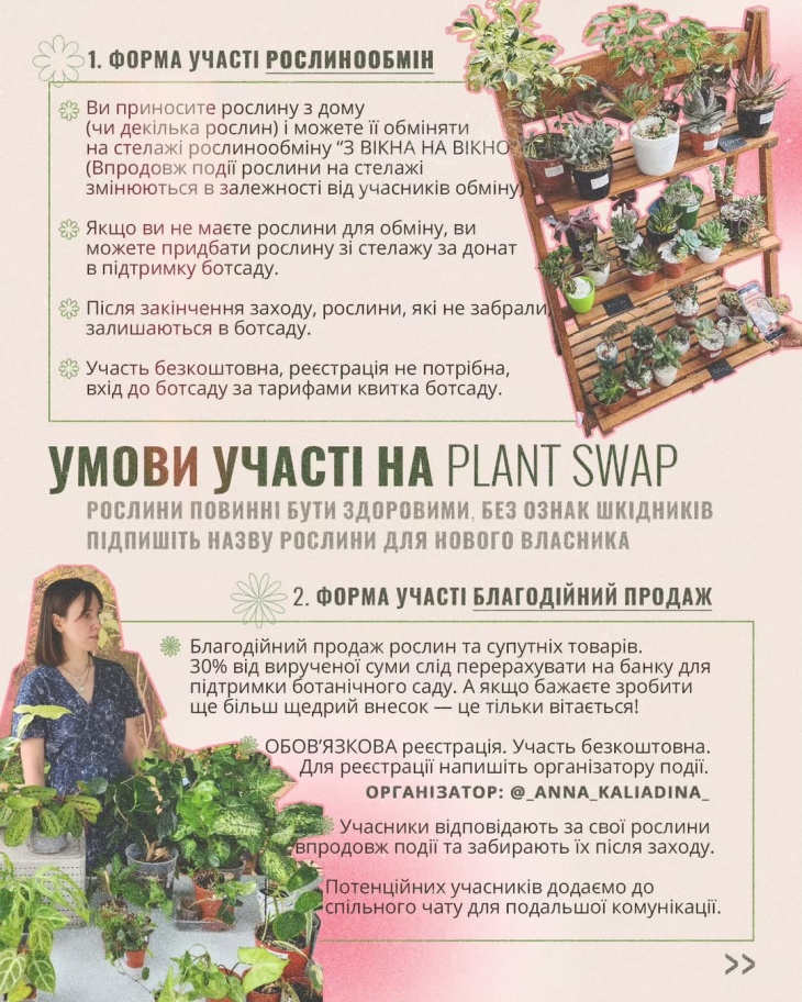 - Якщо ви не маєте рослини для обміну, а якась рослина сподобалась зі стелажу – можете придбати її за донат в підтримку ботсаду.