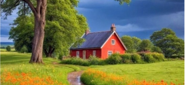 Мы рисуем красками, передавая красоту природы: величественное зеленое дерево, яркое небо и милый красный домик среди цветущих полей ✨