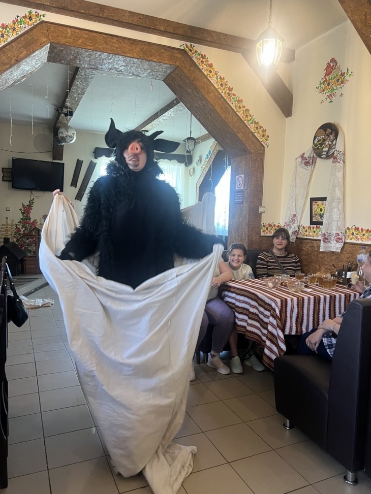 Питание: обед (галушки, салат, блинчики с творогом, узвар) входит в стоимость пребывания в музее гастрономии, ужин (борщ, хлеб, картофель с мясом по-хуторянски, чай) входит в стоимость входного билета на пребывание в Диканьском Курене (500 грн/чел.).